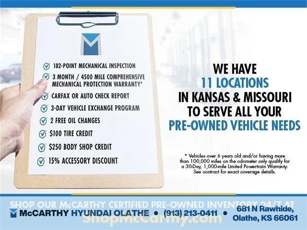 Thank you for checking out this vehicle at McCarthy Olathe Hyundai! Please call 913-213-0411 to get more details on this vehicle and to schedule a test drive. We are located at 683 N. Rawhide Dr. Olathe, KS 66061. All prices include discounts as described, specifications and availability are subject to change without notice.