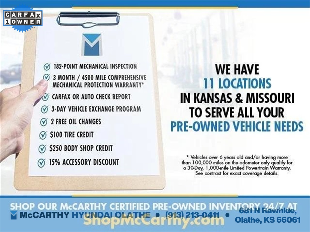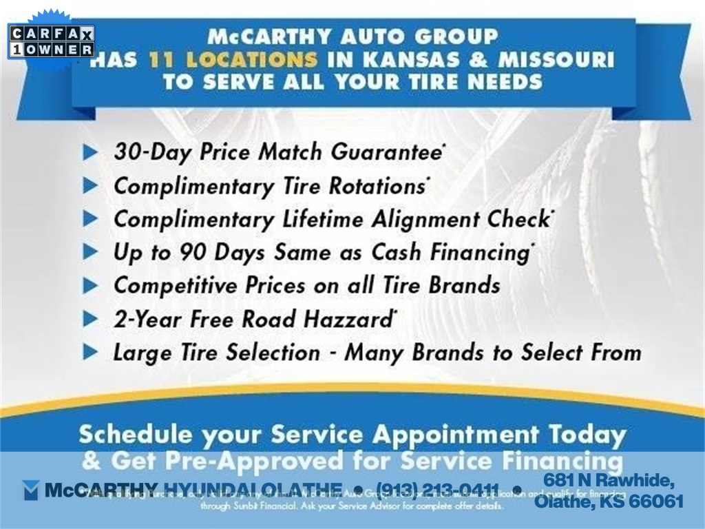 Thank you for checking out this vehicle at McCarthy Olathe Hyundai! Please call 913-213-0411 to get more details on this vehicle and to schedule a test drive. We are located at 683 N. Rawhide Dr. Olathe, KS 66061. All prices include discounts as described, specifications and availability are subject to change without notice.