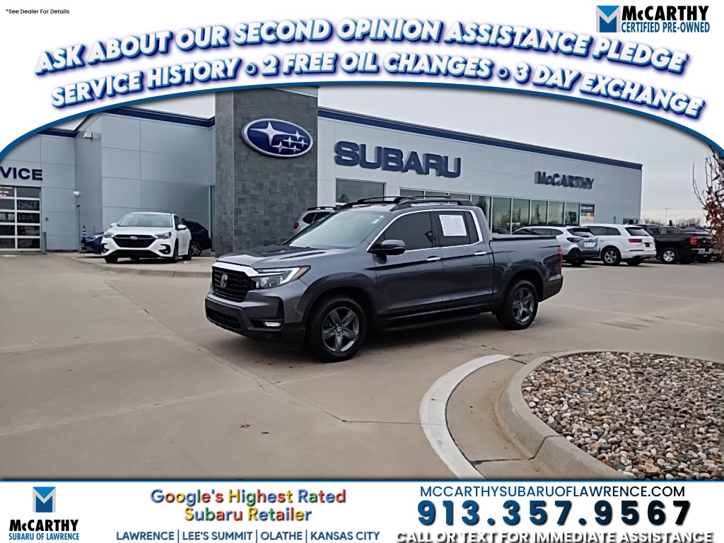 Meet the 2022 Honda Ridgeline RTL-E AWD, the pickup that behaves like a luxury SUV during the week and a weekend workhorse by Saturday morning. Smart, smooth, and sneaky-capable, this Ridgeline proves you don't need to rattle your fillings to enjoy truck-level versatility. And here at **McCarthy Subaru of Lawrence**, every vehicle, including this handsome Honda, comes with a **Free Warranty**, a full **Inspection Checklist**, and the peace of mind that we can **sign and ship anywhere in the United States**. Convenience? That's kind of our thing.